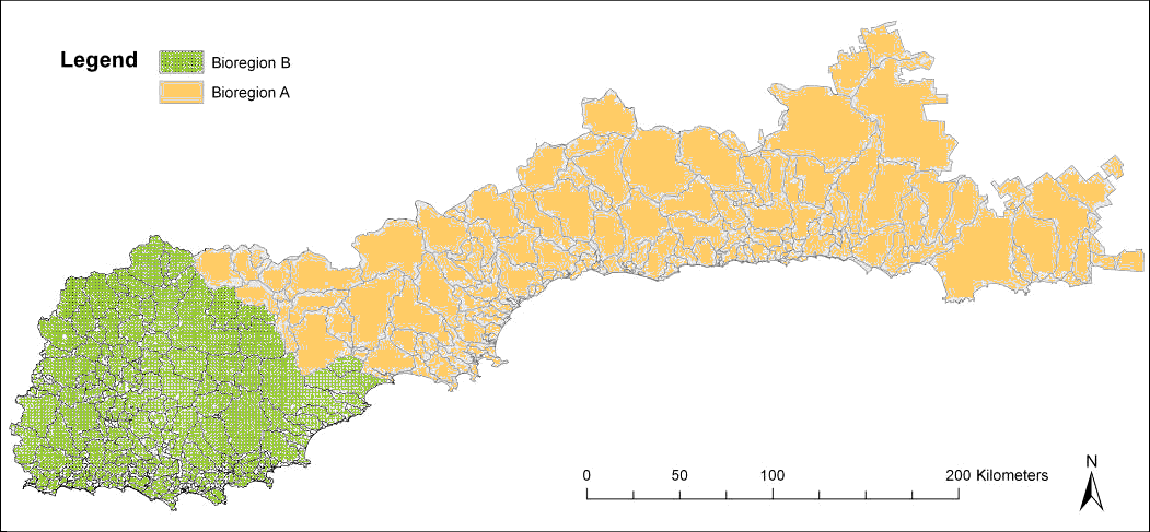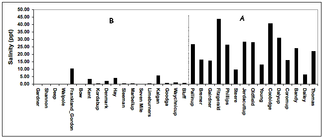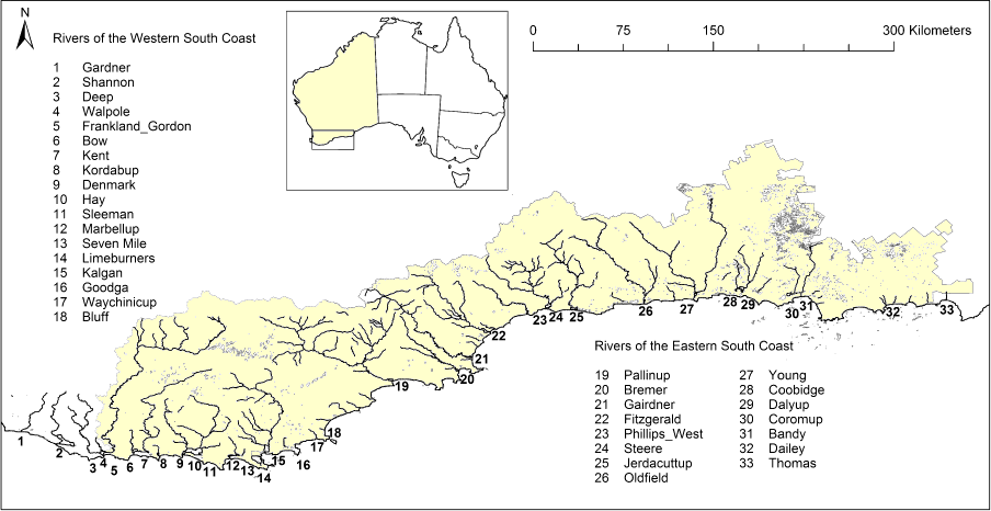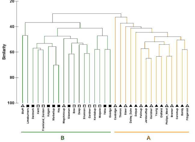 Above is a dendrogram based on macroinvertebrate data. It shows the existence of two broad aquatic bioregions, (A) eastern south coast and (B) western south coast. The western region includes the rivers from the Gardner to the Bluff, while the eastern region extends from the Pallinupo River to the Thomas River. This division and some of the lower-level groupings indicated on the dendrogram coincided rather poorly with the Interim Biogeographic Regionalisation of Australia (IBRA), a continent-wide regionalization of landscape patterns, based on data on climate, geomorphology, landform, and terrestrial biota. This illustrates the limitations of the IRBA for riverine flora and fauna, and suggests that a more specific classification designed for rivers may be more useful.
