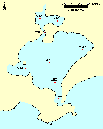 A sampling run is to be completed every three months. On a sampling run data are collected from eight standard sites (WN01 to WN08) as shown. Sites WN01 and WN02 are located in Walpole Inlet, WN03 is in the exchange channel and the remaining sites are in Nornalup Inlet. At sites WN01 to WN07 surface and bottom waters are collected and sent to Australian Environmental Laboratories for the analysis of nutrient levels. The nutrients that are measured are ammonia, oxides of nitrogen (nitrate and nitrite), total nitrogen, filterable reactive phosphorus, total phosphorus, colour, chlorophyll and phaeophytin pigments. A brief description of these terms is provided below. A hydrolab multiprobe is used at each site to collect temperature, salinity, specific conductivity and dissolved oxygen data at approximately 0.5 metre intervals. Secchi disk depths are also collected at each site. Phytoplankton samples are collected from sites WN01, WN02, WN04 and WN07 and sent to the Phytoplankton Ecology Unit of the Water and Rivers Commission for microscope identification.