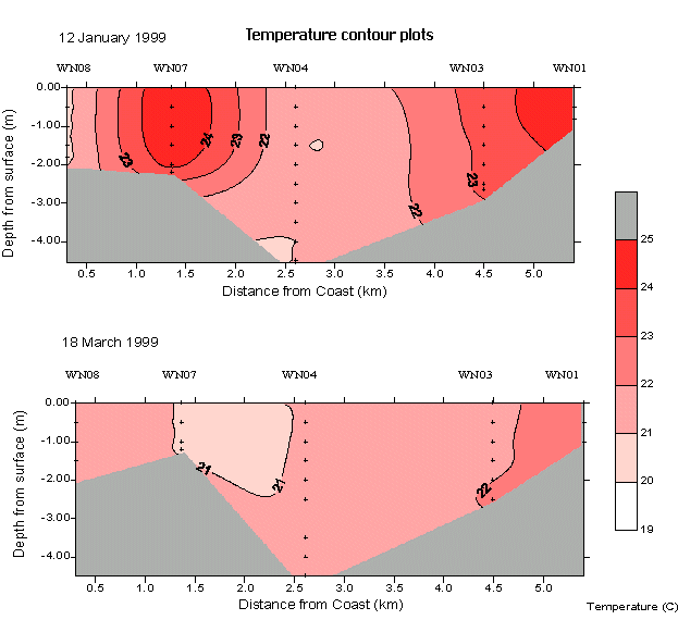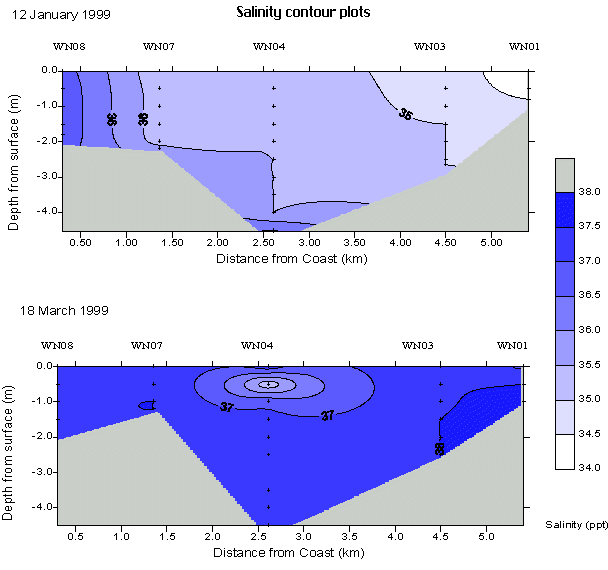 The salinity and temperature data collected for each run are presented in contour plots below. The contour plots are used to represent the distribution of parameters across several sampling sites. The transect for the plots runs in roughly a northerly direction, passing through sites WN08, WN07, WN04, WNO03 and WN01, with the ocean entrance to the left. The points at which a measurement was taken is indicated as a small cross. The bottom profile on the plots is only a guide and is not an accurate indication of the bathymetry of the inlet.
