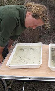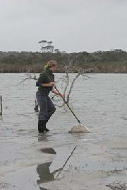 Water Quality and Macroinvertebrate Collection Methods Sampling is carried out by staff from the Department of Water, Albany Regional Office. All wetland sites are sampled twice per year in autumn and the spring. Water samples are collected using a clean well rinsed bucket. For total nutrients (TN/TP) and turbidity, water is then poured into a rinsed sample container and placed on ice or ice bricks ready for lab analysis. For the dissolved nutrients (soluble reactive phosphorus, NOx-N, NH3-N/NH4-N), dissolved ions (Na, Ca, Cl, Mg, K and sulphate) and colour, water is filtered through a 0.45um cellulose nitrate filter paper before filling the sample container. A known volume, usually 1000mL, of site water is filtered through a GFC filter paper to capture chlorophyll a. The paper is then wrapped inside another filter paper and placed in an envelope and on ice or ice bricks ready for lab analysis. Macroinvertebrate information is obtained through two separate sweeps (two by 50 metre sweeps stretching to either side of sample point), using a triangular framed net made of a 250um mesh and with a 400mm wide aperture at the base. For each sweep the sampler wades slowly through the water for a distance of 50 metres sweeping (in a forward and up and down motion through the water column) over a distance of approximately one metre from the bank to the bank's edge (or further depending on water depth). The sampler works the net through the emergent vegetation (e.g. sedges and rushes), among woody debris and in the deeper water to ensure all wetland habitat types are captured. Macroinvertebrates are rinsed into a bucket and through a series of graded sieves into sorting trays for identification. Two trained people then sort through the trays for a pre-determined amount of time identifying the types and approximate quantities of macroinvertebrates present. Macroinvertebrate groups and abundance are recorded on field sheets. Relative variation in water level is measured by surveying the water level relative to an established reference point (star picket) with a local datum. A Sokia automatic level and staff are used to establish the difference in level between the wetland and the reference point. Field observations recorded on each visit include weather conditions, cloud cover, fringing vegetation types and condition, and obvious macroalgae or surface scum as well as weediness and disturbance. At each site, photos are taken from a predetermined location to assist with assessment of temporal changes in wetland and fringing vegetation condition. Storage of data All insitu and laboratory water quality data is stored on the Department of Water WIN database in Perth. Macroinvertebrate, photographic and associated information is stored in spreadsheets and folders on the Department of Water Albany office server. All data and information are available by contacting Tracy Calvert at the Albany office on 9842 5760. |