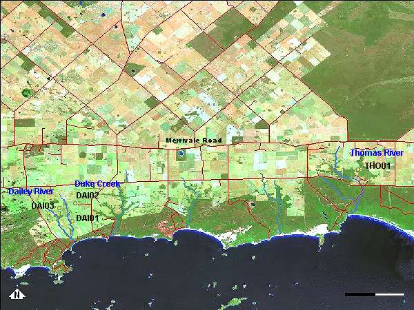 Three sites were sampled on the the Dailey and Duke river systems and one on the Thomas River; they are shown on the map above. Photographs are available for each site: