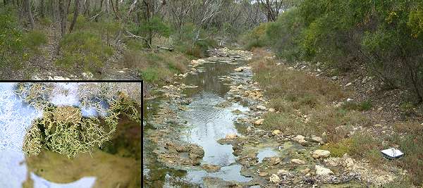 Inset: Calcium encrustation over the filamentous algae produced hardened sheets and filaments at the surface of the water.