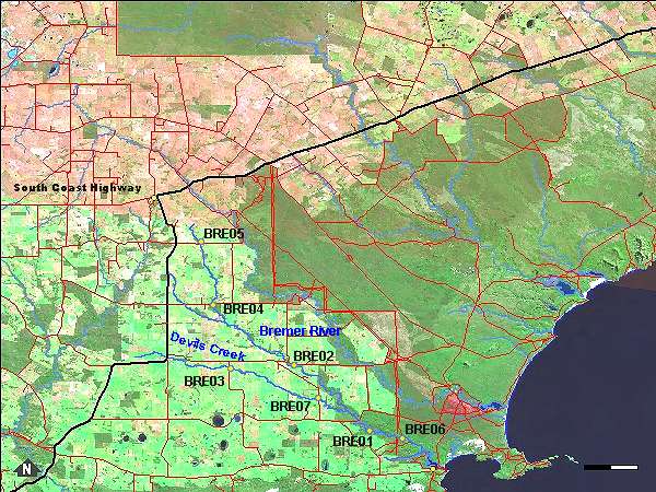 Seven sites were sampled in the Bremer River system. An overview of sampling sites on the Bremer River and Devil's Creek is shown on the map above. There were two sampling runs for the Bremer River catchment, one in 2006 and one in 2007. Photographs are available for each site: