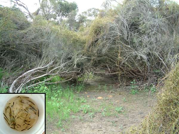 Inset: Three species of fish were present in this pool. The larger Jollytail Minnow (Galaxius maculatus) hugging the side of the bucket, smaller Hardyheads (Leptatherina wallacei) clustering in the centre of the bucket and fat Gobies (Pseudogobius olorum) on the bottom of the bucket.